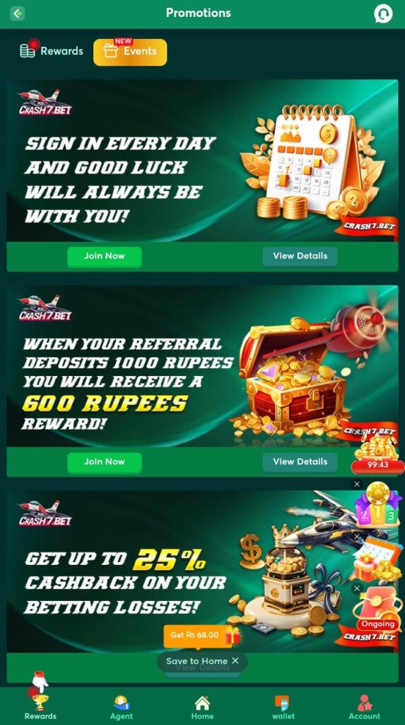 The sports category includes virtual sports betting and prediction games. Users can bet on the outcome of football, cricket, and other simulated events. It’s a fast-paced way to combine sports knowledge with earning potential, all within the Crash7 platform.